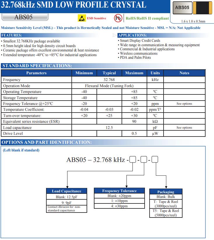 | ABS05-32.768KHZ-T | Abracon艾博康 | ABS05 | 32.768kHz | 2-SMD, No Lead |