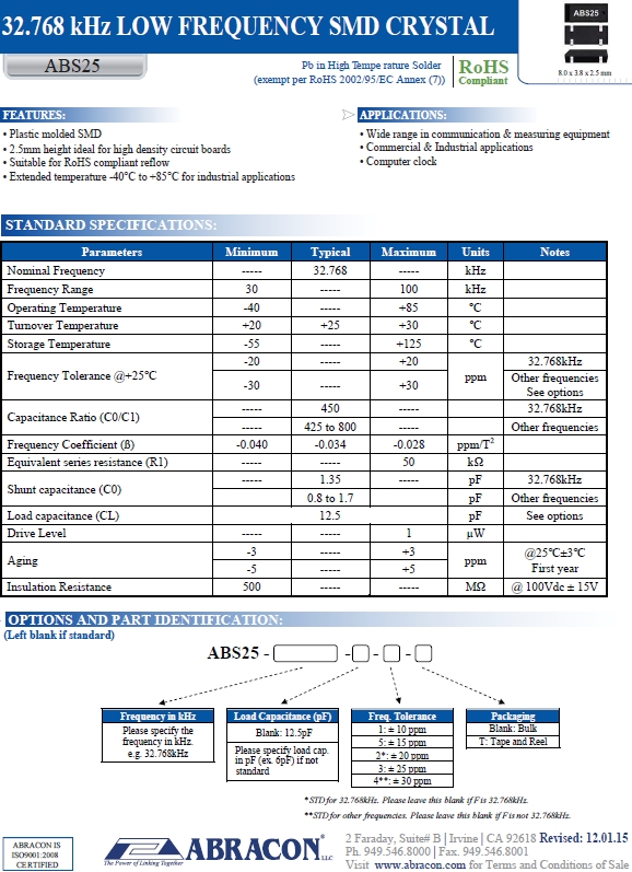 | ABS25-32.768KHZ-6-T | Abracon晶振 | ABS25 | kHz Crystal (Tuning Fork) | 32.768kHz |