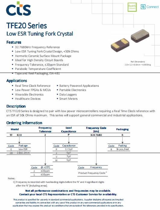 | TFE202W32K7680R | CTS晶振 | TFE20 | 32.768kHz | 0.079" L x 0.047" W (2.00mm x 1.20mm) |