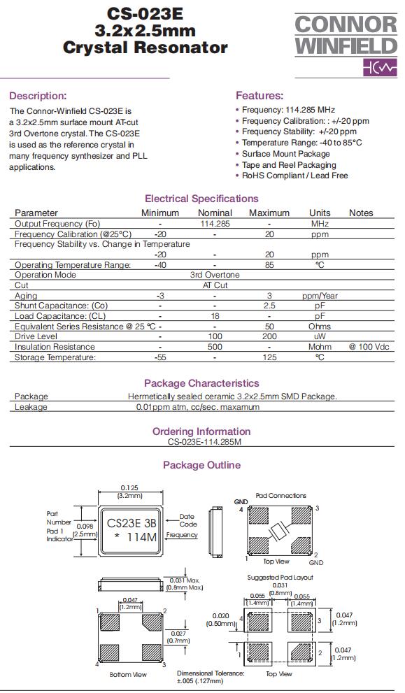 ConnorWinfield無(wú)源晶振,CS-023-114.285M,車載導(dǎo)航儀6G晶振,CS-018-114.285MHZ,石英貼片晶振,參數(shù)表