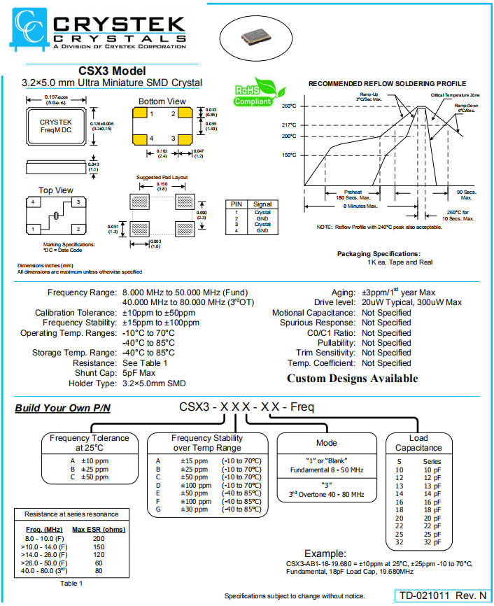 CRYSTEK晶振,CSX3晶振,無源環(huán)保晶體.小型表面貼片晶振型,是標(biāo)準(zhǔn)的石英晶體諧振器,適用于寬溫范圍的電子數(shù)碼產(chǎn)品,家電電器及MP3,MP4,播放器,單片機(jī)等領(lǐng)域.可對(duì)應(yīng)8.000MHz以上的頻率,在電子數(shù)碼產(chǎn)品,以及家電相關(guān)電器領(lǐng)域里面發(fā)揮優(yōu)良的電氣特性,滿足無鉛焊接的回流溫度曲線要求.