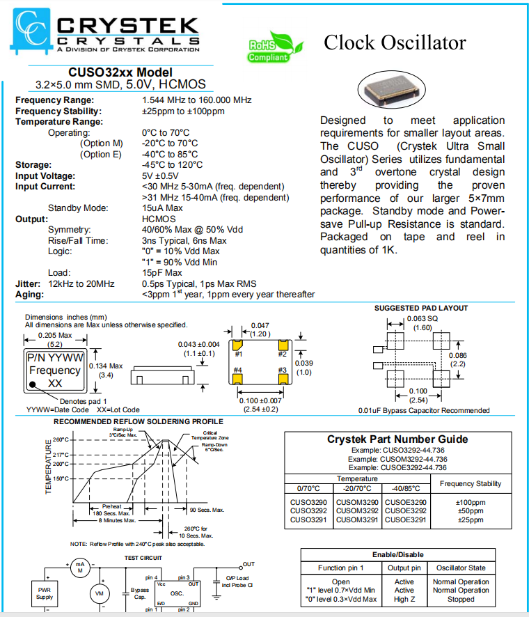 CRYSTEK晶振,CUSO32xx晶振,時鐘晶體振蕩器.有源晶振,是只晶體本身起振需要外部電壓供應,起振后可直接驅動CMOS集成電路,產品本身已實現與薄型IC(TSSOP封裝,TVSOP封裝)同樣的1mm厚度,斷開時的消費電流是15µA以下,編帶包裝方式可對應自動搭載及IR回流焊接(無鉛對應)產品有幾種電壓供選1.8V,2.5V,3V3.3V,5V,以應對不同IC產品需要.