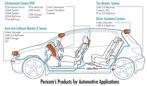 現今半導體零件是汽車不可或缺的一部分.一輛平常的車輛可能包含多達100樣電子控制組件(ECU)在像是引擎、傳動、到主動式安全系統到車載乘客舒適與信息娛樂等不同的系統中.Pericom提供從時鐘到USB控制器等許多不同的產品,可以適用于這些系統中.