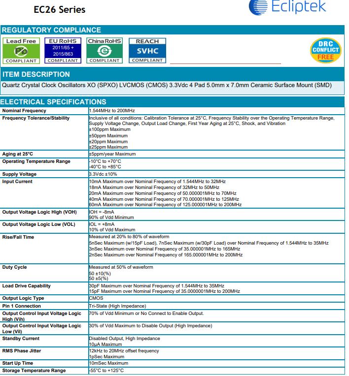 EC26石英晶體振蕩器,ECLIPTEK晶振,EC2600ETTTS-20.000M-TR晶振,小型SMD有源晶振,從最初超大體積到現(xiàn)在的7050mm,6035mm,5032mm,3225mm,2520mm體積,有著翻天覆地的改變,體積的變小也使產(chǎn)品帶來(lái)了更高的穩(wěn)定性能,接縫密封石英晶體振蕩器,精度高,覆蓋頻率范圍寬的特點(diǎn),SMD高速自動(dòng)安裝和高溫回流焊設(shè)計(jì),Optionable待機(jī)輸出三態(tài)輸出功能,電源電壓范圍:1.8V~5V,高穩(wěn)定性,低抖動(dòng),低功耗,主要應(yīng)用領(lǐng)域:無(wú)線通訊,高端智能手機(jī),平板筆記本W(wǎng)LAN,藍(lán)牙,數(shù)碼相機(jī),DSL和其他IT產(chǎn)品的晶振應(yīng)用,三態(tài)功能,PC和LCDM等高端數(shù)碼領(lǐng)域,符合RoHS/無(wú)鉛.