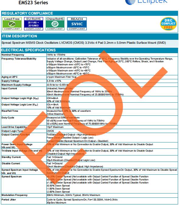 日蝕歐美晶振,EMS23有源晶體,EMS23CHA-24.000M-TR振蕩器,服務是ECLIPTEK晶振成功的基石.我們時時為客戶著想,盡力滿足并超越客戶對于我們的石英晶振,貼片晶振,電壓晶體元件,晶體振蕩器,有源晶振等產品的質量要求以及服務價值.憑借先進的設備一流的技術以及公司訓練有素的服務團隊,多方面的滿足各領域客戶的不同需求,從而成為晶振行業內的最佳資源之一.
