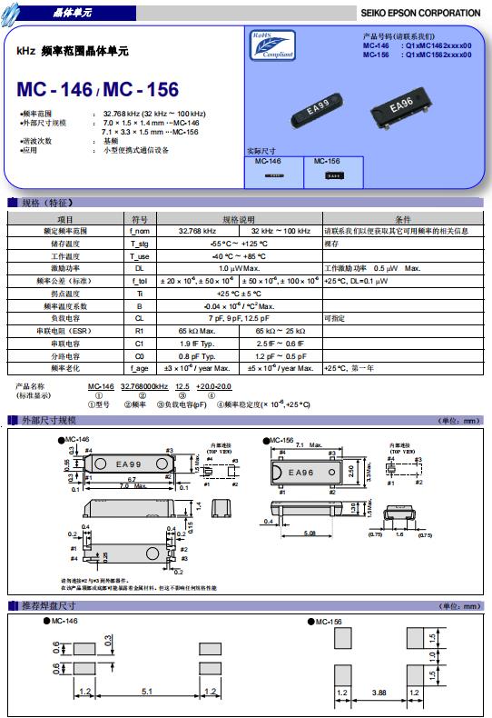 愛普生晶振MC-146,Q13MC1462000300陶瓷諧振器,日本進口愛普生晶振,貼片無源晶振,貼片諧振器,型號MC-146,編碼Q13MC1462000300是一款陶瓷面貼片型的32.768K時鐘晶體體,頻率32.768KHZ,負載7pf,精度10ppm,工作溫度-40to+85°C,產品具備出色性能,具有成本效益,非常適合用于智能家居,無線網絡,便攜式產品等領域.