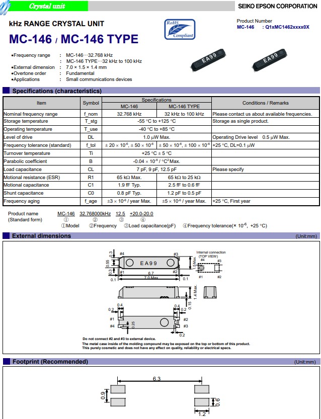 | Q13MC1462001200 | 7 x 1.5 x 1.4 mm | MC-146 | 32.768000 kHz | 12.5 pF | +/-30.0 ppm | -40 to +85 °C |