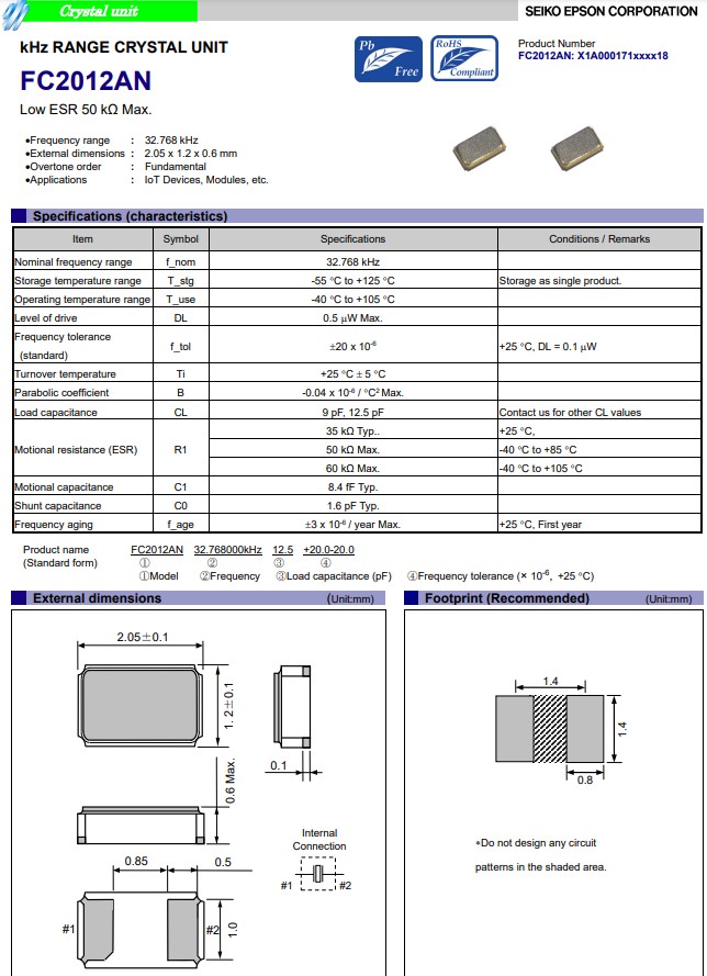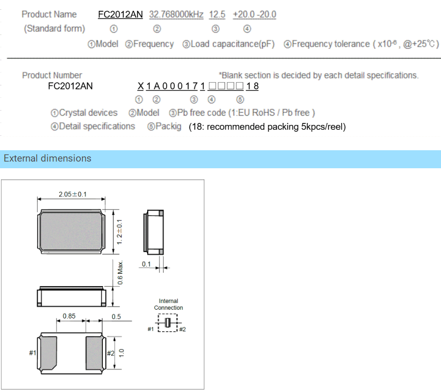 | X1A000171000100 | FC2012AN | 32.768kHz | 2.05 x 1.2 x 0.6 mm | 12.5 pF | +/-20.0 ppm |