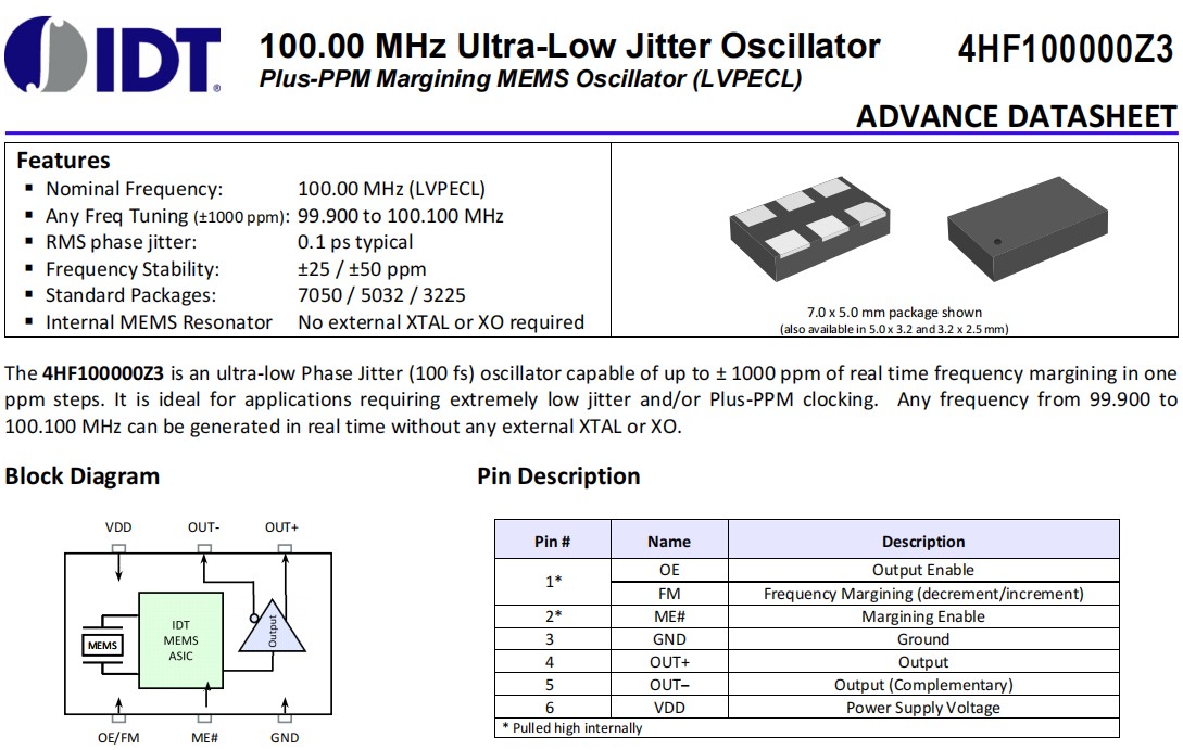 | 4HF100000Z3BACXGI | Renesas晶振 | MEMS OSC XO 100.0000MHZ LVPECL |