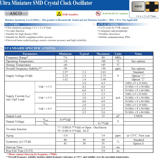 Abracon晶振,ASCO-12.000MHZ-EK-T3貼片晶振,ASCO有源晶振.小型表面貼片晶振型,是常用的石英晶體振蕩器,適用于寬溫范圍的電子數碼產品,家電電器及MP3,MP4,播放器,單片機等領域.可對應8.000MHz以上的頻率,在電子數碼產品,以及家電相關電器領域里面發(fā)揮優(yōu)良的電氣特性,滿足無鉛焊接的回流溫度曲線要求.