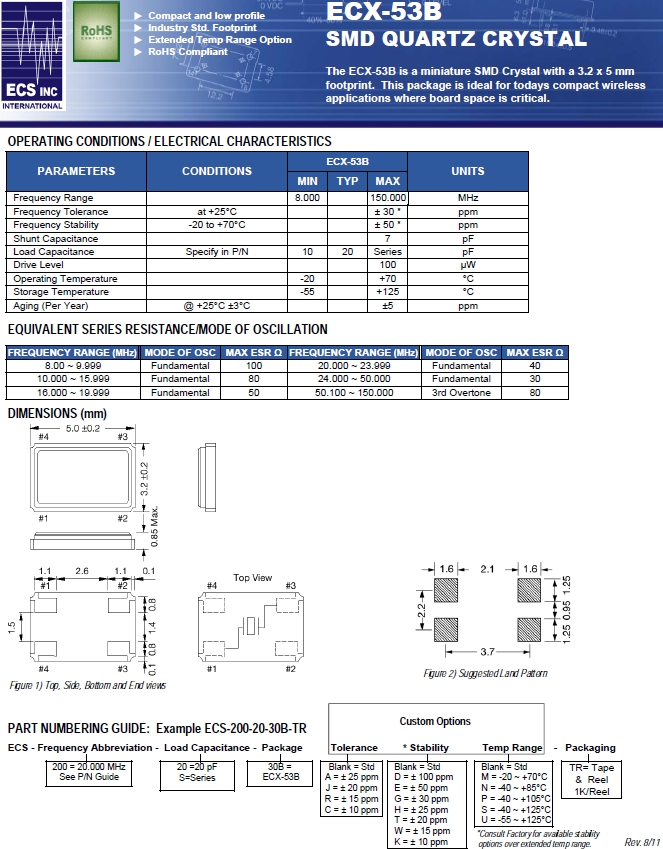 ECS晶振,ECS-135.6-8-30B-CKM壓電晶振,ECX-53B諧振器.貼片晶振本身體積小,薄型石英晶體諧振器,特別適用于有目前高速發展的高端電子數碼產品,因為晶振本身小型化需求的市場領域,小型,薄型是對應陶瓷諧振器(偏差大)和普通的石英晶體諧振器(偏差小)的中間領域的一種性價比較出色的產品.產品廣泛用于筆記本電腦,無線電話,衛星導航HDD,SSD,USB,Blu-ray等用途,符合無鉛焊接的高溫回流焊曲線特性.