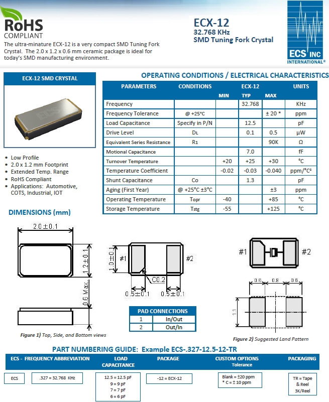 ECS晶振,ECS-.327-12.5-12-TR晶體,ECX-12千赫晶振.貼片石英晶體,體積小,焊接可采用自動貼片系統,產品本身小型,表面貼片晶振,特別適用于有小型化要求的電子數碼產品市場領域,因產品小型,薄型優勢,耐環境特性,包括耐高溫,耐沖擊性等,在移動通信領域得到了廣泛的應用,晶振產品本身可發揮優良的電氣特性,滿足無鉛焊接的高溫回流溫度曲線要求.