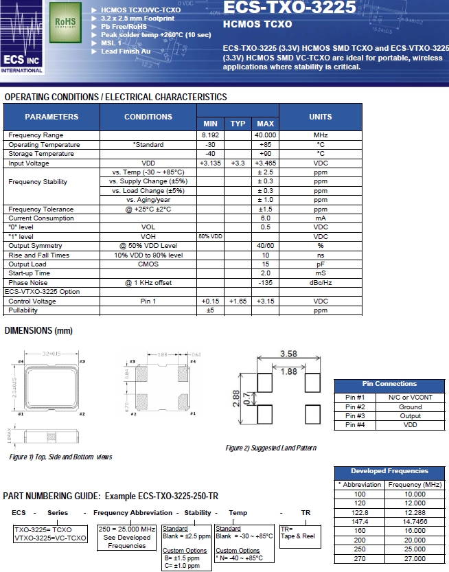 ECS晶振,ECS-TXO-3225-100-TR晶體振蕩器,ECS-TXO-3225振蕩子.小型貼片有源晶振,體積的變小也使產品帶來了更高的穩定性能,接縫密封石英晶體振蕩器,精度高,覆蓋頻率范圍寬的特點,貼片高速自動安裝和高溫回流焊設計,Optionable待機輸出三態輸出功能,電源電壓范圍:1.8V?5V,高穩定性,低抖動,低功耗,主要應用領域:無線通訊,智能手機,平板筆記本WLAN,藍牙,數碼相機,DSL和各式IT產品的晶振應用,三態功能,PC和LCDM等數碼領域,符合RoHS/無鉛.