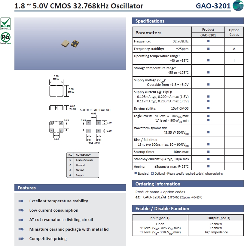 Golledge晶振,石英晶振,GAO-3201表晶.小型,薄型,質地輕的表面貼片音叉型晶體振蕩器,手機晶體,產品體積小,特別適用于各種小巧的便攜式消費電子數碼產品,在移動通信領域廣泛的應用,晶振產品本身可發揮優良的電氣特性,滿足無鉛焊盤的高溫回流溫度曲線要求.