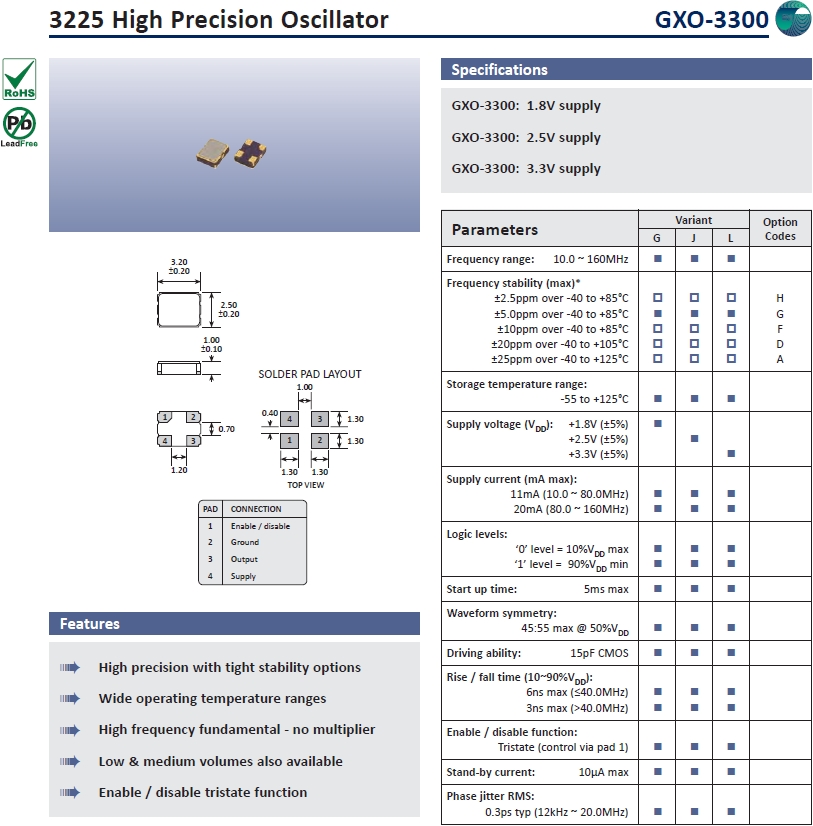 Golledge晶體,Golledge Crystal,GXO-3300石英振蕩子.3225mm體積貼片晶振適用于消費電子領域的表面貼片型石英晶振,本產品已被確定的高信賴性適合用于汽車電子部件,晶體在嚴酷的環境條件下也能發揮穩定的起振特性,晶振本身具有耐熱,耐振,耐沖擊等優良的耐環境特性,滿足無鉛焊接的高溫回流溫度曲線要求,符合AEC-Q200認證.