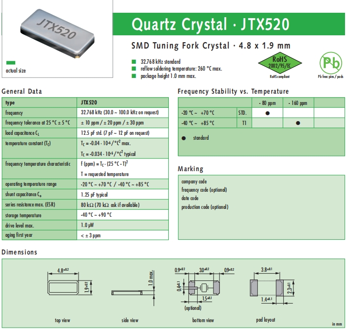 JAUCH晶振,JTX520晶振,高性能石英晶體.貼片晶振本身體積小,超薄型石英晶體諧振器,特別適用于有目前高速發展的高端電子數碼產品,因為晶振本身小型化需求的市場領域,小型,薄型是對應陶瓷諧振器(偏差大)和普通的石英晶體諧振器(偏差小)的中間領域的一種性價比較出色的產品.產品廣泛用于筆記本電腦,無線電話,衛星導航HDD, SSD, USB, Blu-ray等用途,符合無鉛焊接的高溫回流焊曲線特性.