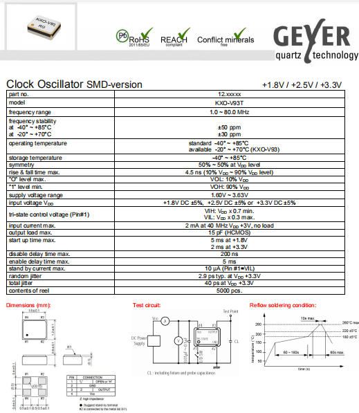 Geyer晶振,KXO-V93T晶振,高品質(zhì)振蕩器.普通貼片石英晶振外觀使用金屬材料封裝的,具有高穩(wěn)定性,高可靠性的石英晶體振蕩器,晶振外觀本身使用金屬封裝,充分的密封性能,可確保其高可靠性,采用編帶包裝,外包裝采用朔膠盤,可在自動貼片機上對應(yīng)自動貼裝等優(yōu)勢.