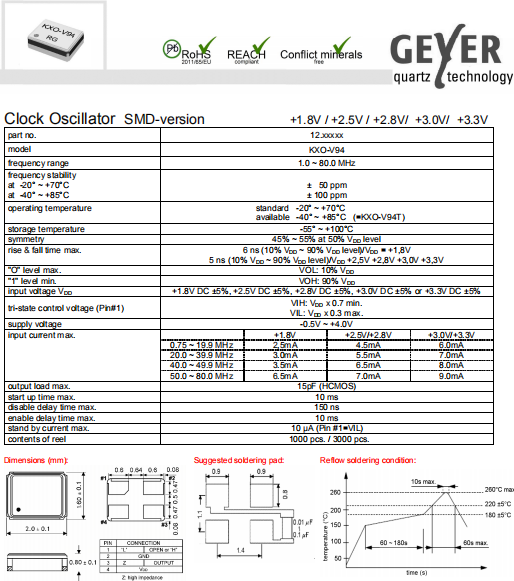 Geyer晶振,KXO-V94晶振,SPXO晶體振蕩器.貼片式石英晶體振蕩器,低電壓啟動功率,并且有多種電壓供選擇,比如有1.8V,2.5V,3.3V,3.8V,5V等,產品被廣泛應用于,平板筆記本,GPS系統,光纖通道,千兆以太網,串行ATA,串行連接SCSI,PCI-Express的SDH / SONET發射基站等領域.符合RoHS/無鉛.