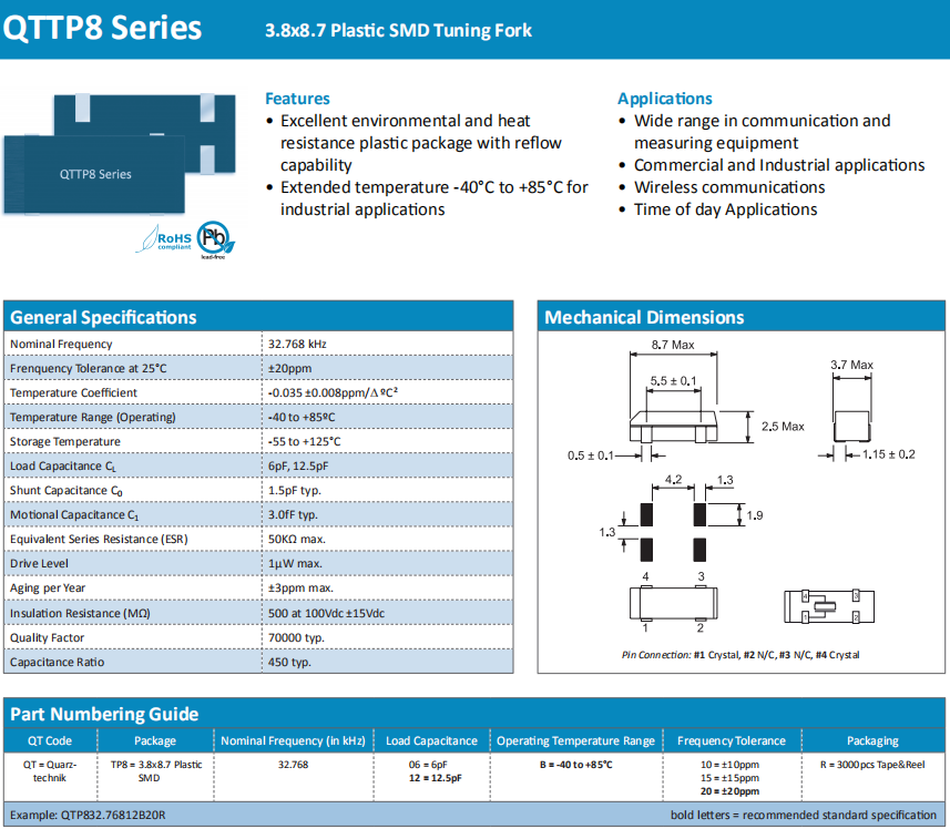 Quarztechnik晶振,QTTP8晶振,水晶振子.小型貼片石英晶振,外觀尺寸具有薄型表面貼片型石英晶體諧振器,特別適用于有小型化要求的市場領域,比如智能手機,無線藍牙,平板電腦等電子數碼產品.晶振本身超小型,薄型,重量輕,晶體具有優良的耐環境特性,如耐熱性,耐沖擊性,在辦公自動化,家電相關電器領域及Bluetooth,WirelessLAN等短距離無線通信領域可發揮優良的電氣特性,滿足無鉛焊接的回流溫度曲線要求.