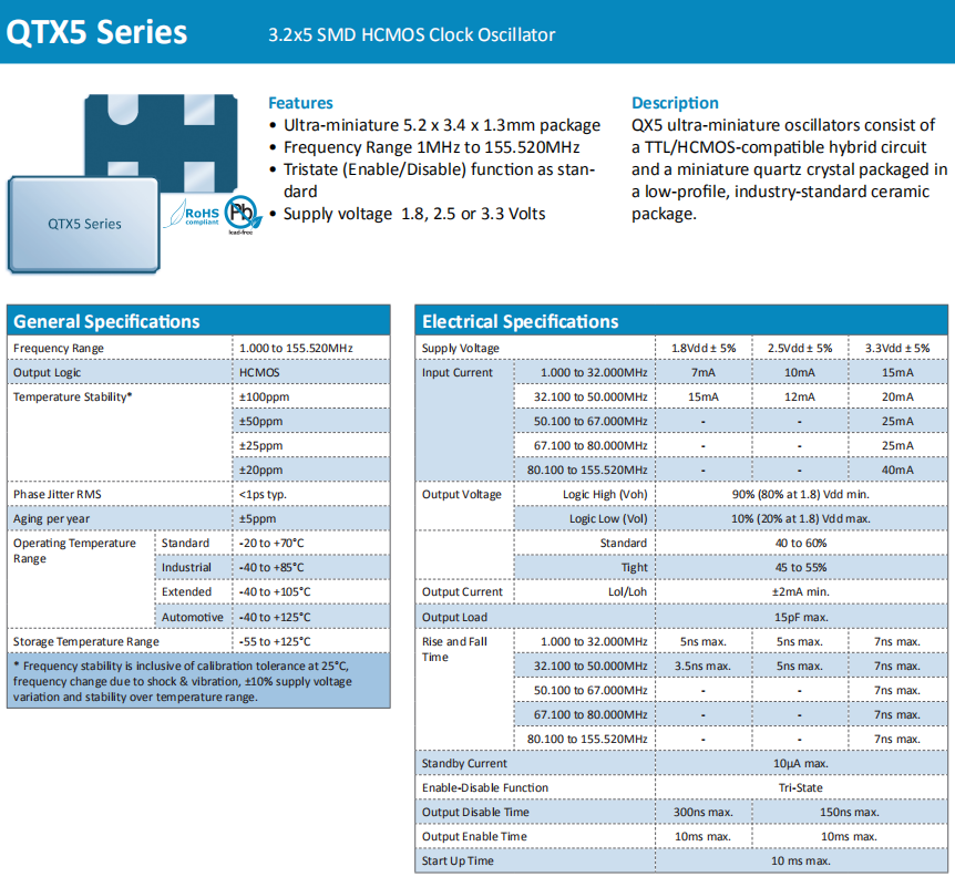 Quarztechnik晶振,QTX5晶振,低損耗振蕩器.5032mm體積的石英晶體振蕩器有源晶振,改產品可驅動2.5V的溫補晶振,壓控晶振,VC-TCXO晶體振蕩器產品,電源電壓的低電耗型,編帶包裝方式,可對應自動高速貼片機自動焊接,及IR回流焊接(無鉛對應),為無鉛產品,超小型,質地輕.產品被廣泛應用到集成電路,程控交換系統,無線發射基站.