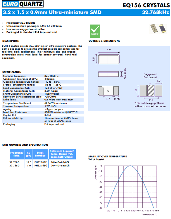 EUROQUARTZ歐洲石英晶振EQ156,32.7680 12.5 PH32768F 20/-40+85/80k,鐘表晶振,3215mm貼片晶振,手持設備晶振,參數表
