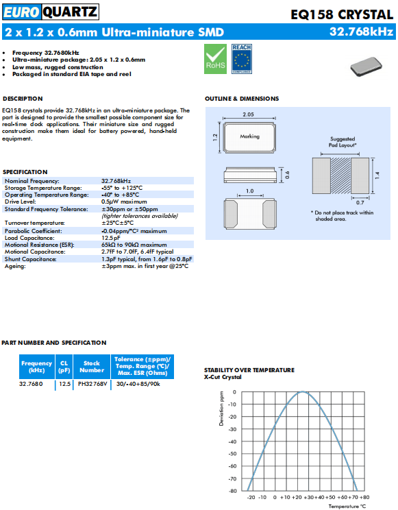 EUROQUARTZ小體積晶振EQ158,32.7680 12.5 PH32768V 20/-40+85/90k,6G無(wú)線晶振,32.768KHz晶振,智能手機(jī)晶振,英國(guó)進(jìn)口晶振,EUROQUARTZ歐洲石英晶振,無(wú)源晶振型號(hào):EQ158,小體積晶振尺寸:2.0x1.2x0.6mm,頻率為:32.768KHz,負(fù)載:12.5pF,精度20ppm,工作溫度范圍:-40℃至+85℃,兩腳貼片晶振,無(wú)源晶振,貼片石英晶振,石英晶體諧振器,無(wú)鉛環(huán)保晶振,具有超小型,輕薄型,耐熱及耐環(huán)境特點(diǎn)。EQ158晶體提供32.768kHz在一個(gè)超微型包裝。該器件旨在為實(shí)時(shí)時(shí)鐘應(yīng)用程序提供盡可能最小的組件尺寸。它們的微型尺寸和堅(jiān)固的結(jié)構(gòu)使它們成為理想的電池供電,手持設(shè)備,電腦主板,儀器儀表設(shè)備,鐘表電子,時(shí)鐘晶振,智能手機(jī),數(shù)碼電子等應(yīng)用。