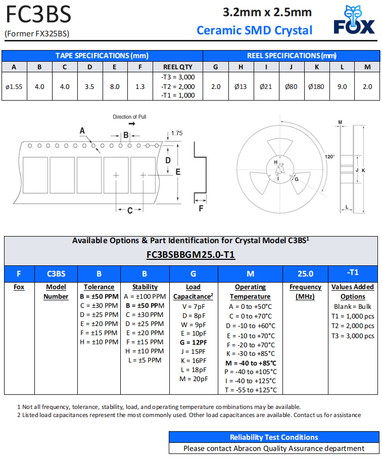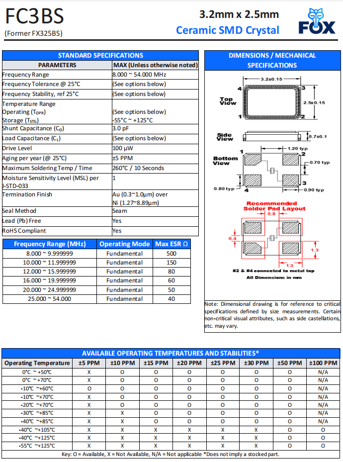 FC3BSBBGM20.0-T1,FOX晶體諧振器,FX325BS石英晶體,6G無線晶振,FC3BSECKP30.0-T1,汽車充電樁晶振,參數表
