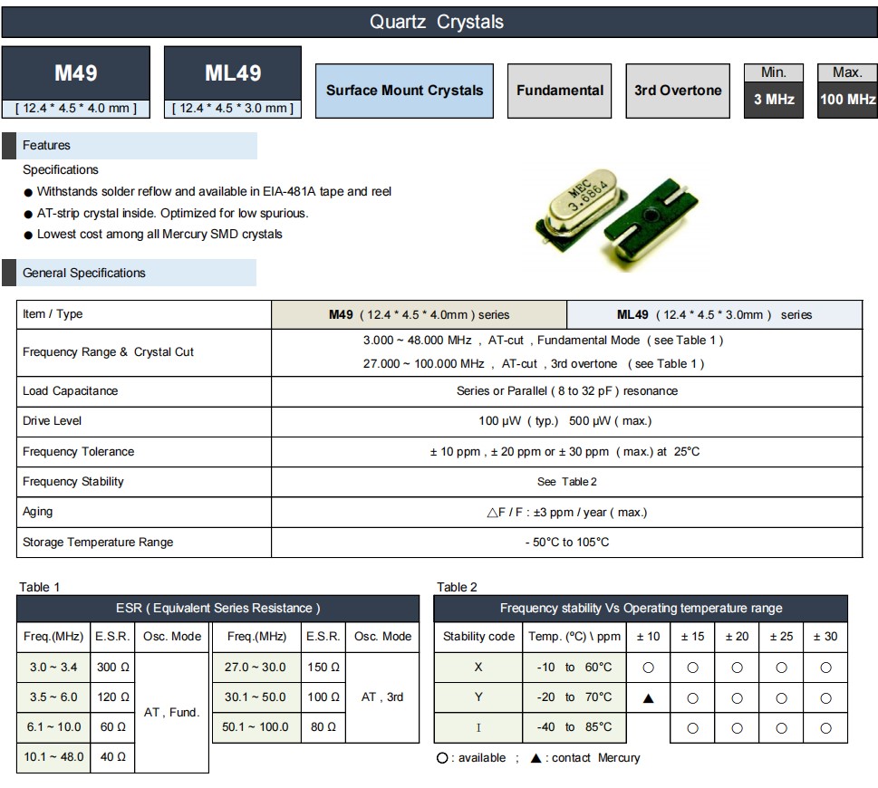 MERCURY貼片晶振,M49-24.000-18-20/30H/15R,6G通訊設備晶振,M49-26.000-12-18/20I/15R,無源晶振,參數表