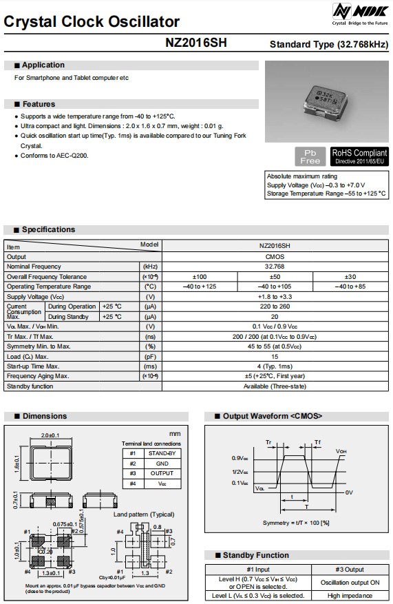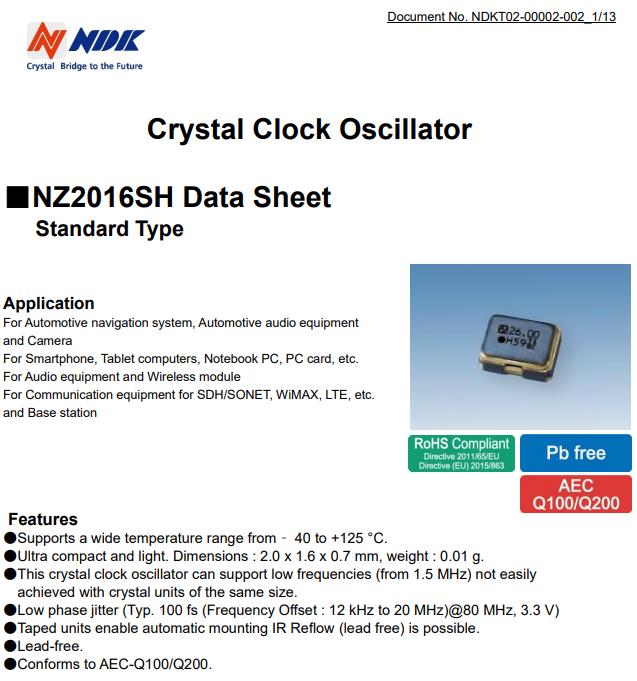 NDK汽車電子專用晶振|NZ2016SH-24.000MHZNSC5022C|2016|1.8V,是一款金屬面貼片型的有源晶振,NDK車規晶振,汽車電子專用晶振,日本進口晶振,石英晶體振蕩器,OSC振蕩器,SMD振蕩器,寬溫晶振,產品特點:支持- 40至+125°C的寬溫度范圍。小巧輕便。尺寸2.0x 1.6x 0.7mm,這種晶體時鐘振蕩器可以支持低頻率(從1.5MHz),用相同尺寸的晶體單元實現。低相位抖動(類型:100fs(頻率偏移:12khz至20mhz)@ 80mhz, 3.3 V),膠帶裝置可自動安裝紅外回流管(無鉛)。應用領域:汽車導航系統、汽車音響設備和攝像機 智能手機、平板電腦、筆記本電腦、PC卡等。 音頻設備和無線模塊,基站等領域。