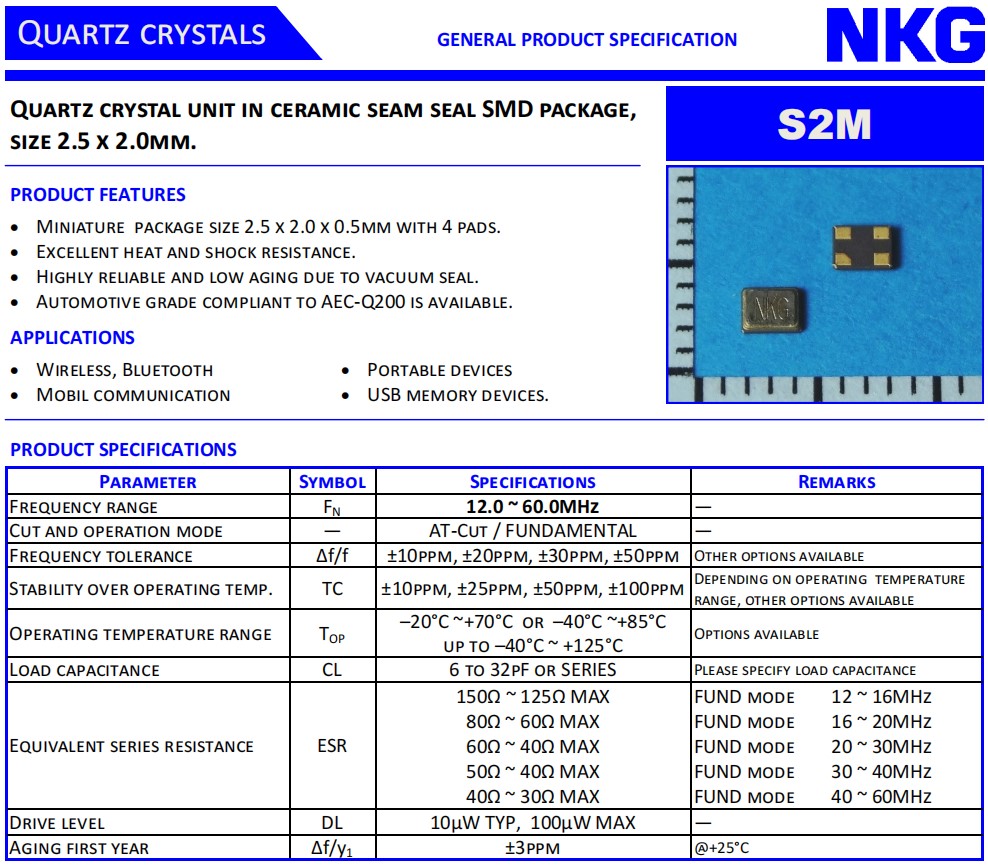 NKG車規晶振,S2M16.0000F18M23-EXT,6G無線模塊晶振,參數表