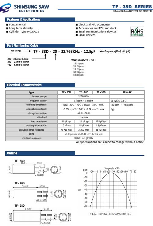 SHINSUNG晶振,TF-26D插件石英晶振,TF-26D-20-32.768KHz-12.5pF晶振,插件石英圓柱晶振最適合用于比較低端的電子產(chǎn)品,比如兒童玩具,普通家用電器,即使在汽車電子領域中也能使產(chǎn)品高可靠性的使用.并且可用于安全控制裝置的CPU時鐘信號發(fā)生源部分,好比時鐘單片機上的石英晶振,在極端嚴酷的環(huán)境條件下,晶振也能正常工作,具有穩(wěn)定的起振特性,高耐熱性,耐熱循環(huán)性和耐振性等的高可靠性能.