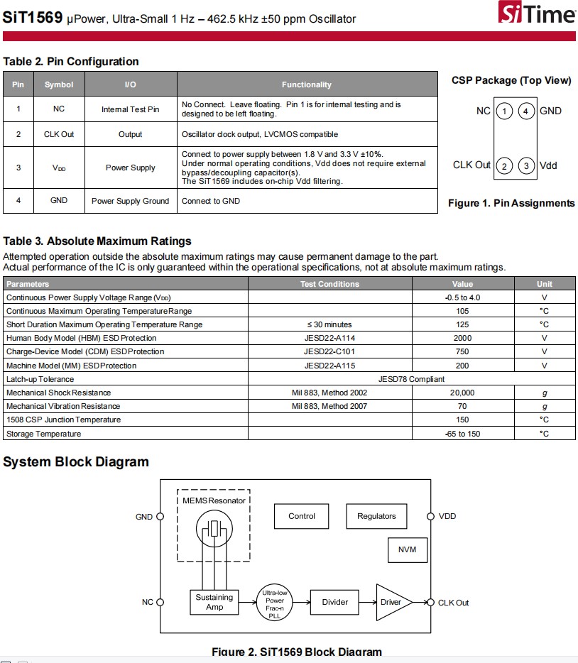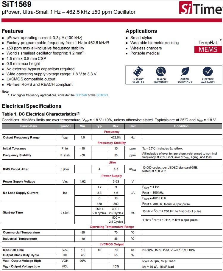 SiTime超小型晶振,SiT1569AI-J3-33E-0462.500000,便攜式醫(yī)療6G晶振,LVCMOS振蕩器,低電壓晶振,美國(guó)進(jìn)口晶振,SiTime晶振,型號(hào):SiT1569,編碼為:SiT1569AI-J3-33E-0462.500000,頻率為:462.5KHz,超小型晶振尺寸:1.5x0.8mm,SMD晶振,四腳貼片晶振,石英晶振,有源晶振,石英晶體振蕩器。超小1Hz-462.5kHz ±50ppm振蕩器,µPower工作電流:3.3µA(100kHz),工廠可編程頻率從1Hz到462.5kHz[1],±50ppmm最大全包頻率穩(wěn)定性,世界最小的占地面積:1.2 mm2,1.5毫米x 0.8毫米CSP,0.6mm最大高度,外部旁路電容器需要,寬供電電壓范圍:1.8V到3.3V,LVCMOS兼容輸出,pb,RoHS和達(dá)到兼容。應(yīng)用:智能手寫筆,可穿戴生物特征傳感,無線充電器,便攜式醫(yī)療。