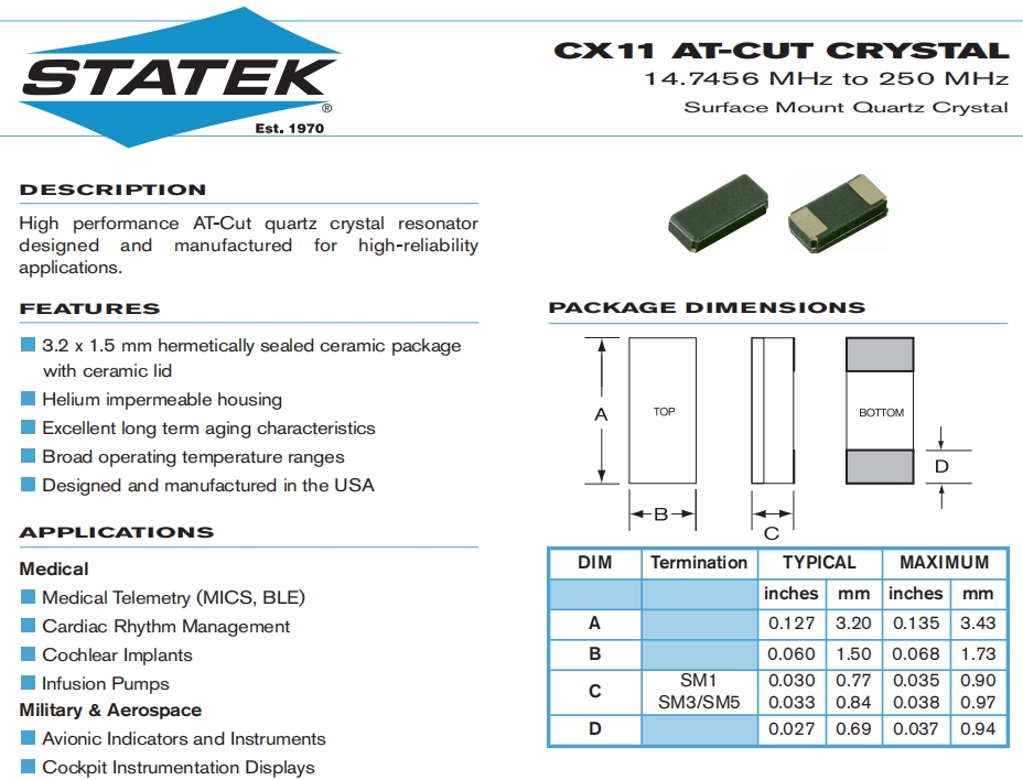 CX11SCSM1-26.0M,50/50/-/I,9pF,Statek貼片晶體,6G儀器設備晶振,尺寸3215mm,頻率26MHZ,美國斯塔克晶振,Statek斯塔克無源晶振,兩腳貼片晶振,陶瓷晶振,無源貼片晶振,SMD晶體諧振器,無源晶振,SMD晶振,3215mm小尺寸晶振,26MHZ貼片晶振,輕薄型晶振,6G儀器設備晶振,通信應用晶振,航空航天專用晶振,數據通信晶振,計算機專用晶振,脈沖發生器專用晶振,工業應用晶振,低損耗晶振,低功耗晶振,高精度無源晶振,高性能晶振.
