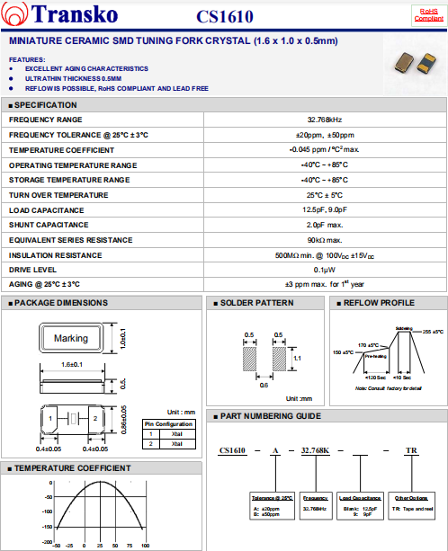 Transko晶振,CS1610晶振,進(jìn)口音叉石英晶體,超小型,薄型,質(zhì)地輕的表面貼片音叉型石英晶體諧振器,手機(jī)晶體,產(chǎn)品體積小,特別適用于各種小巧的便攜式消費(fèi)電子數(shù)碼產(chǎn)品,在移動(dòng)通信領(lǐng)域得到了廣泛的應(yīng)用,晶振產(chǎn)品本身可發(fā)揮優(yōu)良的電氣特性,滿足無鉛焊接的高溫回流溫度曲線要求.