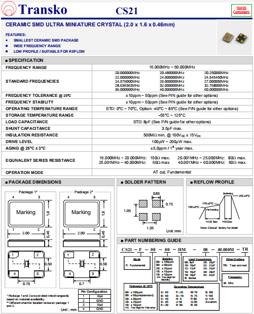 Transko晶振,CS21晶振,高性能石英晶體,貼片石英晶體,體積小,焊接可采用自動(dòng)貼片系統(tǒng),產(chǎn)品本身小型,表面貼片晶振,特別適用于有小型化要求的電子數(shù)碼產(chǎn)品市場(chǎng)領(lǐng)域,因產(chǎn)品小型,薄型優(yōu)勢(shì),耐環(huán)境特性,包括耐高溫,耐沖擊性等,在移動(dòng)通信領(lǐng)域得到了廣泛的應(yīng)用,晶振產(chǎn)品本身可發(fā)揮優(yōu)良的電氣特性,滿足無(wú)鉛焊接的高溫回流溫度曲線要求.