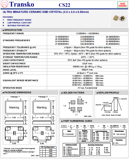 Transko晶振,CS22晶振,進口貼片晶振,小型貼片石英晶振,外觀尺寸具有薄型表面貼片型石英晶體諧振器,特別適用于有小型化要求的市場領域,比如智能手機,無線藍牙,平板電腦等電子數(shù)碼產(chǎn)品.晶振本身超小型,薄型,重量輕,晶體具有優(yōu)良的耐環(huán)境特性,如耐熱性,耐沖擊性,在辦公自動化,家電相關電器領域及Bluetooth,Wireless LAN等短距離無線通信領域可發(fā)揮優(yōu)良的電氣特性,滿足無鉛焊接的回流溫度曲線要求.