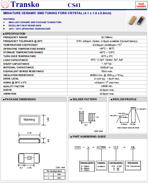Transko晶振,CS41晶振,音叉晶體,貼片壓電石英晶體,體積小,焊接可采用自動(dòng)貼片系統(tǒng),產(chǎn)品本身小型,表面貼片晶振,特別適用于有小型化要求的電子數(shù)碼產(chǎn)品市場(chǎng)領(lǐng)域,因產(chǎn)品小型,薄型優(yōu)勢(shì),耐環(huán)境特性,包括耐高溫,耐沖擊性等,在移動(dòng)通信領(lǐng)域得到了廣泛的應(yīng)用,晶振產(chǎn)品本身可發(fā)揮優(yōu)良的電氣特性,滿足無鉛焊接的高溫回流溫度曲線要求.