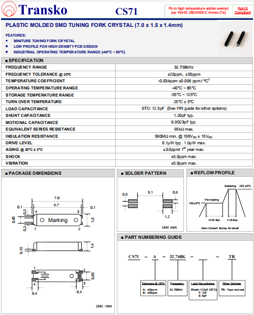 Transko晶振,CS71晶振,音叉水晶振子,小型貼片石英晶振,外觀尺寸具有薄型表面貼片型石英晶體諧振器,特別適用于有小型化要求的市場(chǎng)領(lǐng)域,比如智能手機(jī),無線藍(lán)牙,平板電腦等電子數(shù)碼產(chǎn)品.晶振本身超小型,薄型,重量輕,晶體具有優(yōu)良的耐環(huán)境特性,如耐熱性,耐沖擊性,在辦公自動(dòng)化,家電相關(guān)電器領(lǐng)域及Bluetooth,Wireless LAN等短距離無線通信領(lǐng)域可發(fā)揮優(yōu)良的電氣特性,滿足無鉛焊接的回流溫度曲線要求.