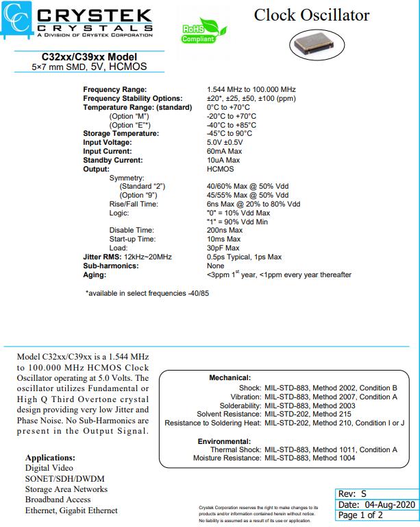 | CE3391-19.440 | CRYSTEK振蕩器 | C33 | XO (Standard) | 19.44MHz | ±25ppm | -40°C ~ 85°C |