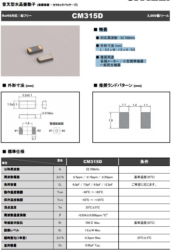 | CM315D32768EZFT | Citizen Finedevice Co Ltd | CM315D | kHz Crystal (Tuning Fork) | 32.768kHz |