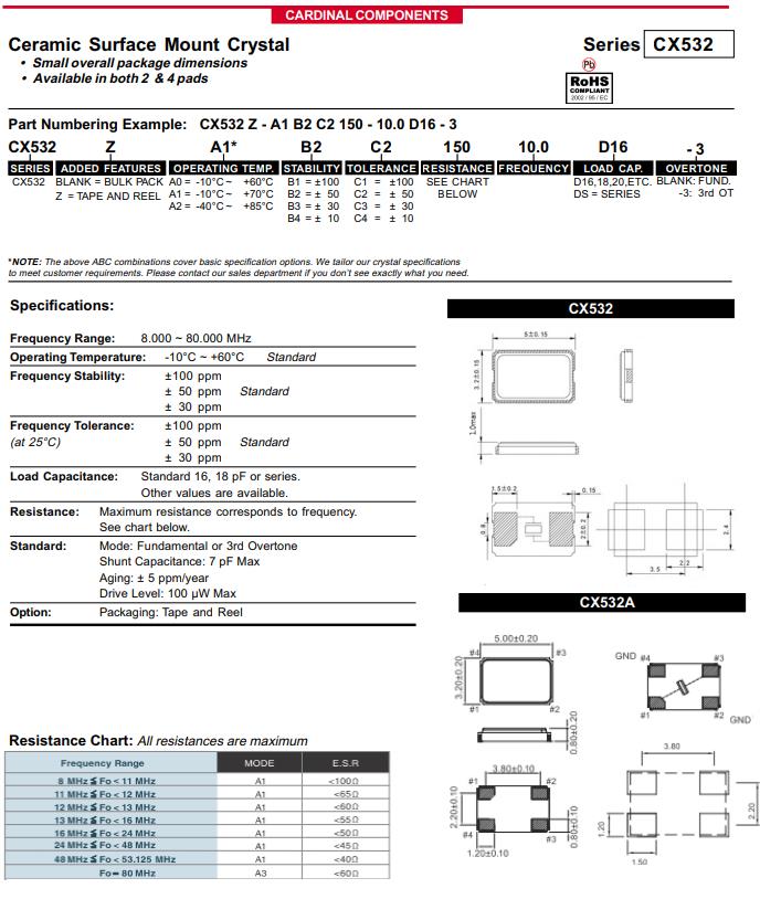 | CX532Z-A2B3C5-70-8.0D18 | Cardinal晶振 | CRYSTAL 8.0000MHZ 18PF SMD | CX532 | 8MHz | ±30ppm | 70 Ohm | -40°C ~ 85°C |