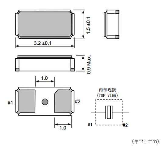 本產品的輸出頻率為32.768 kHz,尺寸為3.2×1.5 mm,t=0.9 mm Max.,頻率公差為±20×10-6,并使工作溫度范圍達到了-40~+125 ℃。