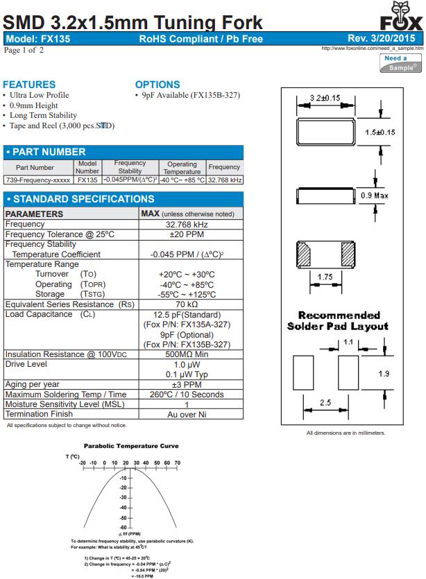| FX135A-327 | FOX晶振 | FX135A | kHz Crystal (Tuning Fork) | 32.768kHz | - |