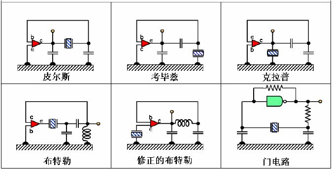 在許多振蕩器電路中,有三種常用的振蕩器電路,它們是皮爾斯振蕩電路,考畢茲振蕩電路和克拉普振蕩電路。這些振蕩電路除了頻射接地點位置不同外,電路的構(gòu)成都是相同的。布特勒和修正的布特勒振蕩電路也是彼此相似的,每一種電路中的發(fā)射極電流就是晶體的電流。門電路振蕩器是皮爾斯型的,它使用了一個邏輯門并在皮爾斯振蕩器的晶體管位置加了一個電阻。(某些門電路振蕩器使用一個以上的門電路。)
