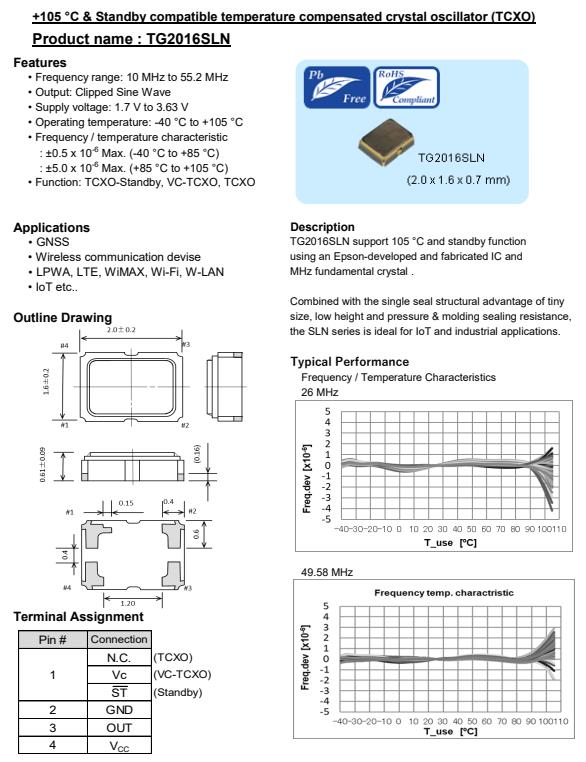 | X1G005731070116 | TG2016SLN | 26.000000 MHz | 2.00 x 1.60 x 0.61 mm | 1.700 to 1.900 V | +/-2.0 ppm | -40 to +105 °C | +/-0.50 ppm |