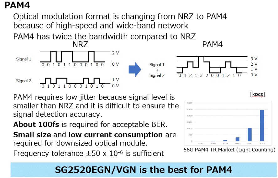 由于物聯(lián)網(wǎng)和ADAS等5G應(yīng)用的實(shí)施,隨著數(shù)據(jù)流量的增長(zhǎng),網(wǎng)絡(luò)基礎(chǔ)設(shè)施變得比以往任何時(shí)候都更加重要。IT廠商一直在快速建設(shè)數(shù)據(jù)中心,對(duì)安裝在數(shù)據(jù)中心內(nèi)部的光模塊有著巨大的需求。這種應(yīng)用要求晶體振蕩器具有“小”、“低抖動(dòng)”和“高穩(wěn)定性”,而我們的SG2520系列貼片石英晶振可以滿足所有這些要求。以下是我們產(chǎn)品的特點(diǎn),這些將有助于光模塊的性能。X1G0058810001專(zhuān)用于6G光學(xué)應(yīng)用的小型封裝高穩(wěn)定性振蕩器