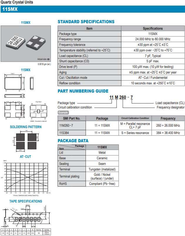 SMI晶振,Quartz crystal,11SMX水晶振子.小體積晶振特性如耐熱性,耐沖擊性,在辦公自動化,家電相關電器領域及Bluetooth,Wireless LAN等短距離無線通信領域可發揮優良的電氣特性,滿足無鉛焊接的回流溫度曲線要求.