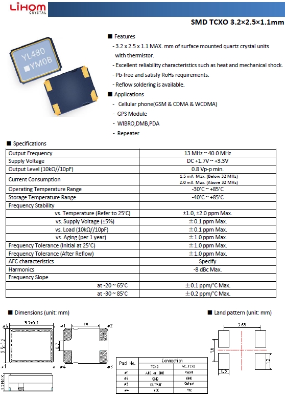 Lihom晶振,溫補晶振, BXT-322(V)石英振蕩器.3225mm體積非常小的貼片晶振器件,是民用小型無線數碼產品的俱佳選擇,小體積的晶振被廣泛應用到,手機藍牙,衛星定位系統,無線通訊集,高精度和高頻率的穩定性能,非常好的減少電磁干擾的影響,是民用無線數碼產品較好的選擇,符合RoHS/無鉛.