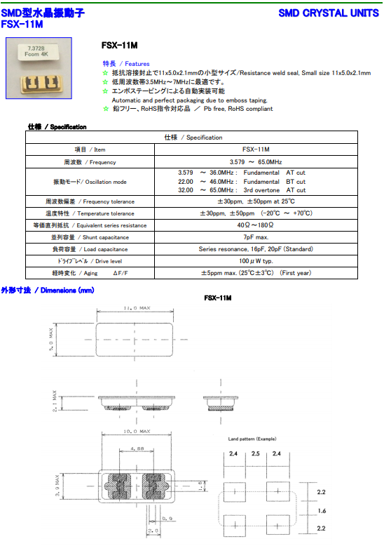 富士晶振,Quartz crystal,FSX-11M晶體.貼片晶振本身體積小,薄型石英晶體諧振器,特別適用于有目前高速發展的高端電子數碼產品,因為晶振本身小型化需求的市場領域,小型,薄型是對應陶瓷諧振器(偏差大)和普通的石英晶體諧振器(偏差小)的中間領域的一種性價比較出色的產品.產品廣泛用于筆記本電腦,無線電話,衛星導航HDD,SSD,USB,Blu-ray等用途,符合無鉛焊接的高溫回流焊曲線特性.
