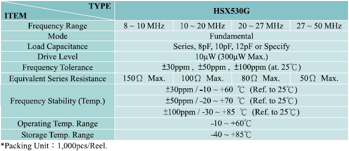 HELE加高原裝正品,HSX530G貼片晶振,無線模塊晶振,尺寸大小5.0*3.2*1.4mm,頻率范圍7.372 to 80.0MHZ,工作溫度-10~+60℃耐高溫環境,小而薄的包和優越的耐熱玻璃密封,本產品適用于敵人回流焊接生產過程中,精度高和優異的耐熱性和可靠性.